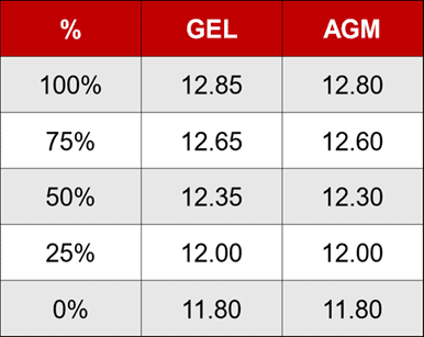 This cut off voltage is considered a surface charge and although required to bring a lead battery to full charge, the battery’s voltage will reduce once the battery sits for approximately 24 hours or has a load placed on the battery. A fully charged battery without a surface charge should level out at approximately 12.80 volts.Â