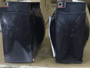 Although under-charging is the most common concern with mobility batteries, over-charging by using a charger that is too large by output amps or a charger that develops an issue with age or physical damage can also be problematic. Although there will be a reduced recharge time when using a larger amperage output charger than originally provided with the equipment when purchased new, this can cause permanent internal damage to the batteries that can drive out all the electrolyte, permanently destroying the battery. This damage is irreversible and can be often noticeable by the smell of sulfur while charging and the battery case’s expansion or appearance of being “bloated.” (See Figure 4)