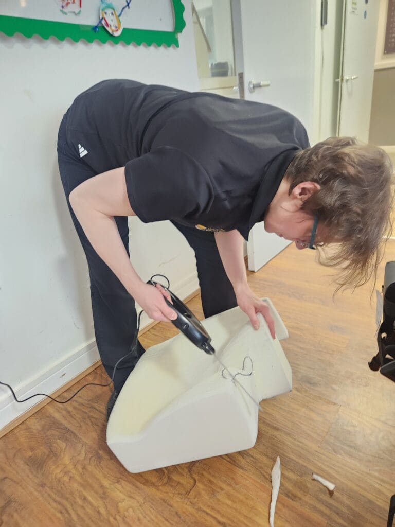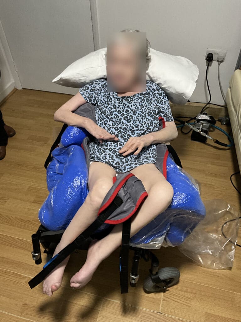 When she moved to her current home, Glenda was unable to sit out of bed safely as the facility did not have a mobility base to fit her unique posture. Glenda had been referred previously for a traditional custom-moulded carved foam seat, but this was abandoned at time of moulding because the size of wheelchair it would require could not fit through any doorway.
