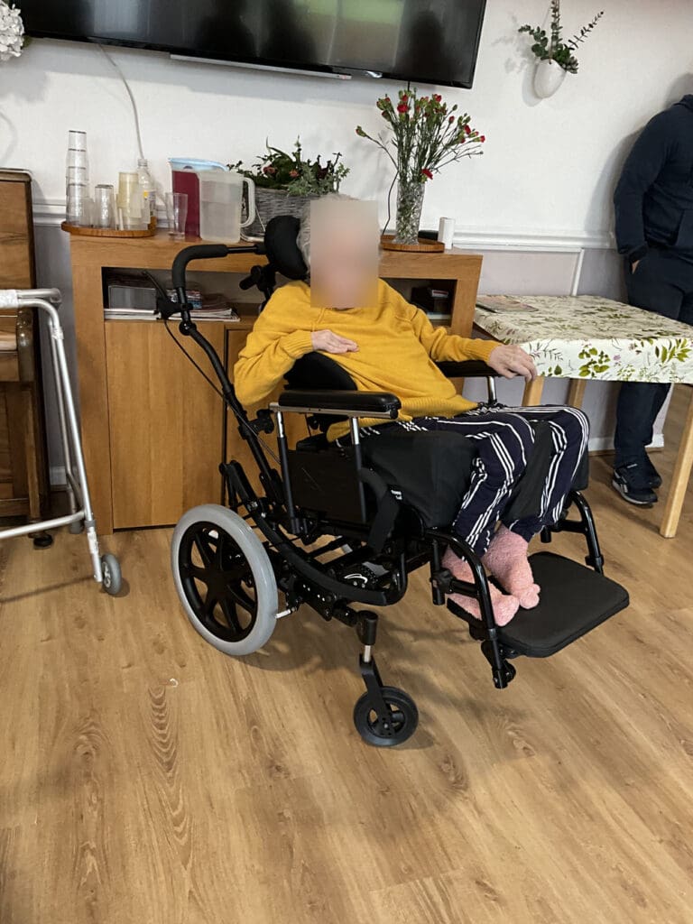 Glenda spent two hours in her new seating and wheelchair. She travelled in the wheelchair into a large dining room at her residential home and met several residents for the first time.